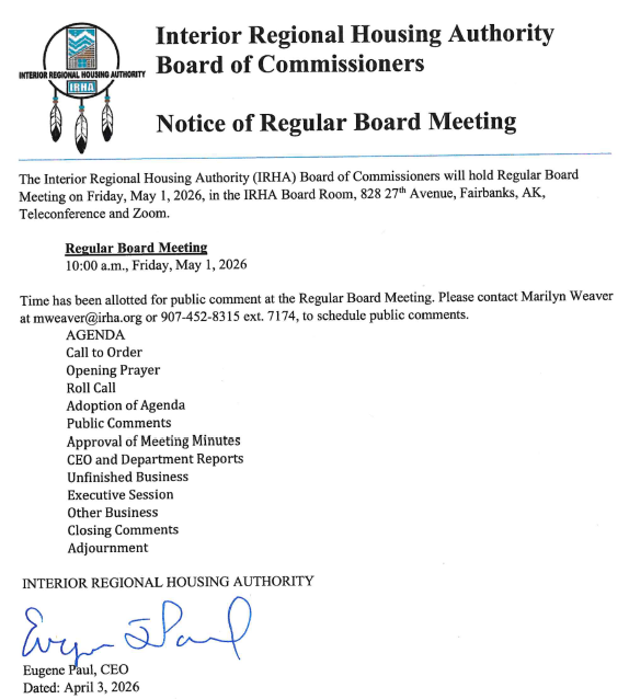 The Interior Regional Housing Authority (IRHA) Board of Commissioners will hold Regular Board Meeting on Friday, May 1, 2026, in the IRHA Board Room, 828 27th Avenue, Fairbanks, AK, Teleconference and Zoom.